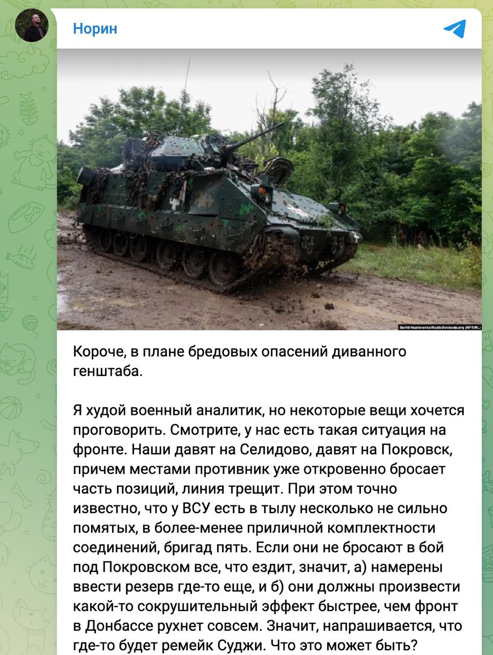 Він вважає, що ВСУ має в резерві не менше п'яти боєздатних бригад, які з якихось причин не кидають на Донбасі зупиняти просування РФ на Покровському напрямку. З чого робить висновок, що готується "ремейк Суджі". Причому новий удар, за його логікою, має статися раніше, ніж український фронт на Донбасі "впаде зовсім".