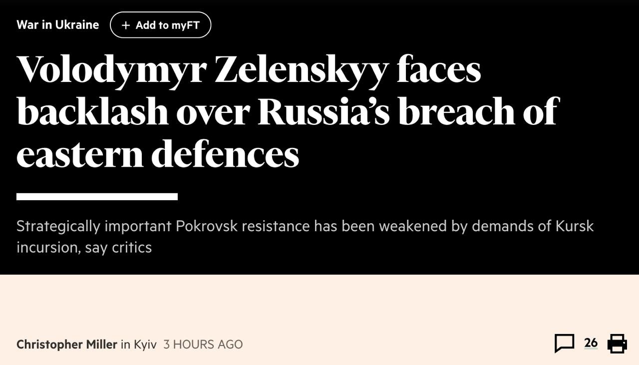 10:02 У Financial Times вийшла стаття з критикою Зеленського через рішення відправити війська наступати під Курськом, а не обороняти Покровськ.
