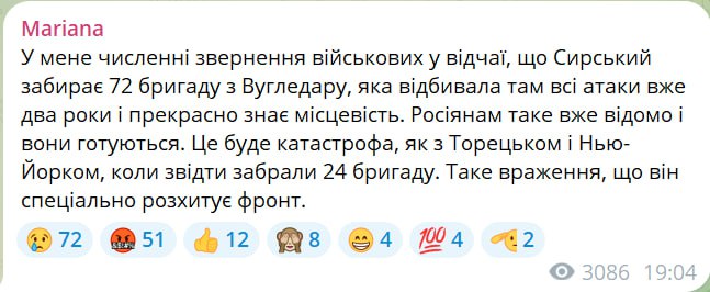 «У мене численні звернення військових у розпачі, що Сирський забирає 72 бригаду з Вугледару, яка відбивала там усі атаки вже два роки і чудово знає місцевість. Росіянам це вже відомо, і вони готуються. Це буде катастрофа, як із Торецьком та Нью-Йорком, коли звідти забрали 24 бригаду. Таке враження, що він спеціально розхитує фронт», – написала Безугла.