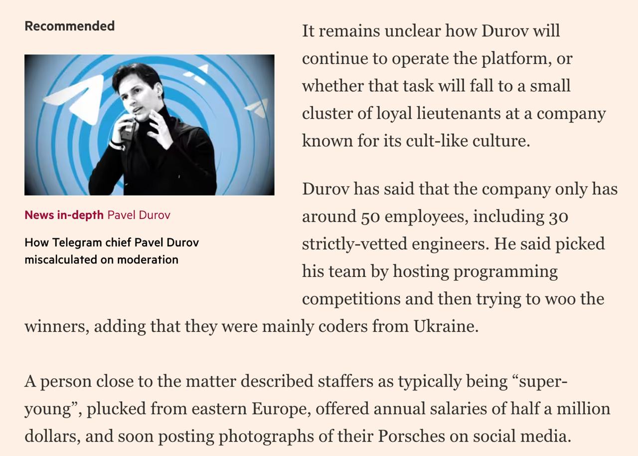 "Дуров сказав, що у компанії всього близько 50 співробітників, включаючи 30 суворо перевірених інженерів. Він сказав, що набирав свою команду, проводячи змагання з програмування, а потім прагнучи виявити переможців, додавши, що в основному це були кодери з України", - сказано у матеріалі видання.