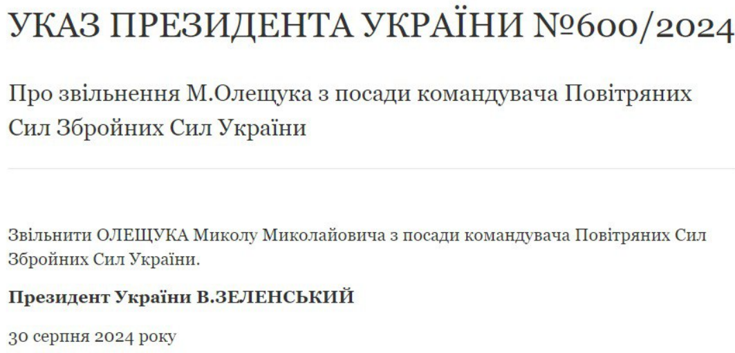 "Звільнити Олещука Миколу Миколайовича з посади командувача Повітряних сил Збройних сил України", - йдеться у документі.