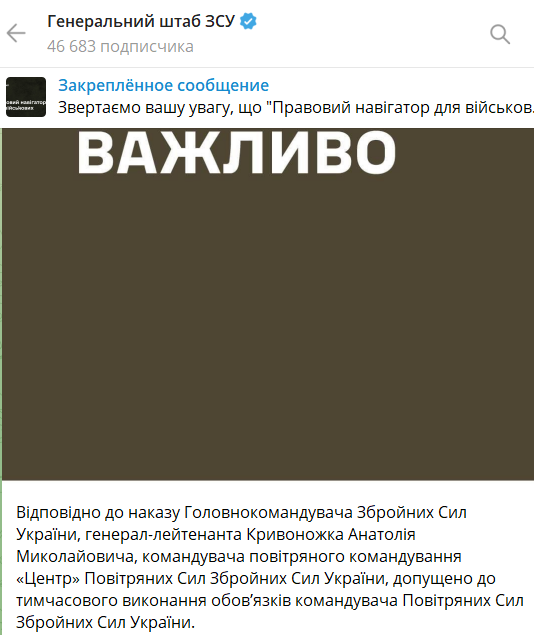"Згідно з наказом Головнокомандувача Збройних сил України, генерал-лейтенанта Кривоніжка Анатолія Миколайовича, командувача повітряним командуванням "Центр" Повітряних сил Збройних сил України, допущено до тимчасового виконання обов'язків командувача Повітряних сил Збройних сил України", - заявили в Генштабі.