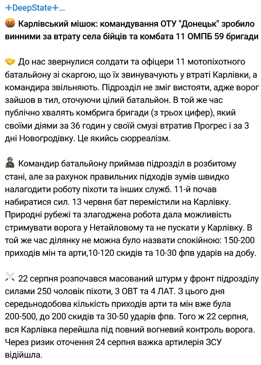 17:51 Командування ОТГ "Донецьк" звинуватило у втраті Карлівки на Покровському напрямку бійців та комбата 11-го мотопіхотного батальйону 59-ї бригади ЗСУ.