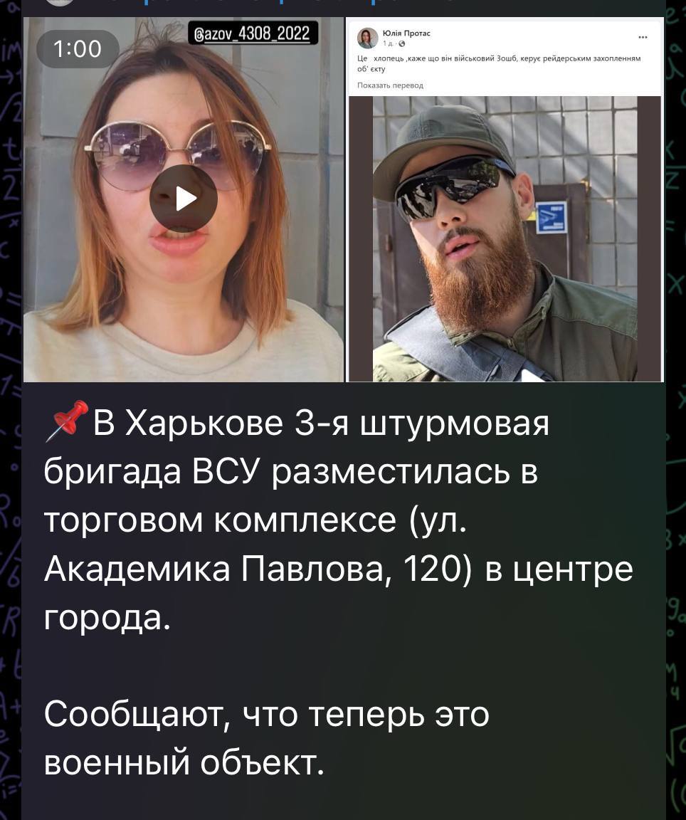 У харківських телеграм-каналах зараз поширюється відео та повідомлення у соцмережах харків'янки, яка заявляє, що 3-я штурмова бригада «здійснила рейдерське захоплення» торговельного центру на Академіка Павлова та оголосила його військовим об'єктом. Що було помічено в російських військових пабликах (скрин повідомлення).