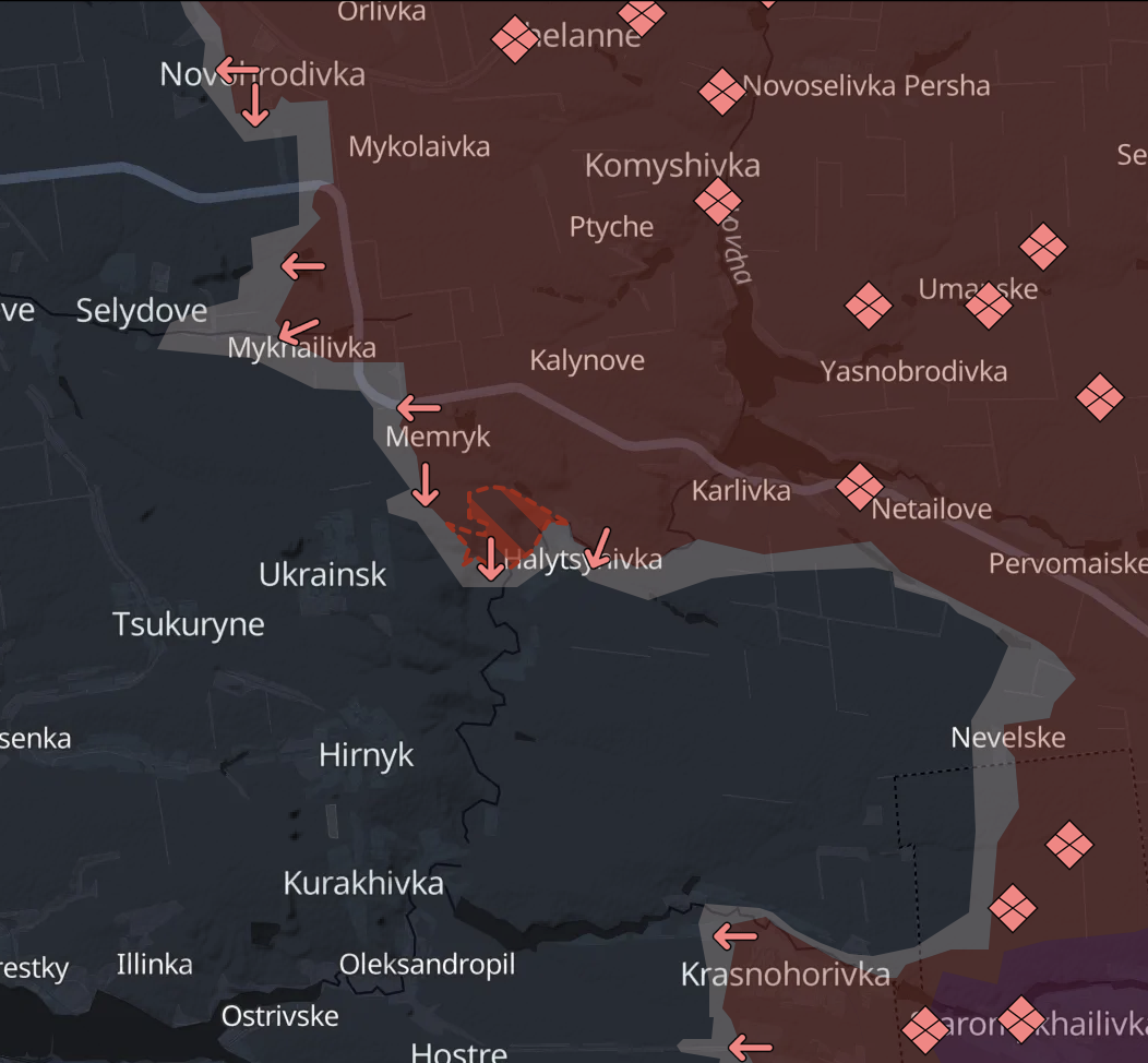 Водночас, стратегічно більш загрозлива ситуація складається для ЗСУ на захід - у районі Селидове та Новогродівки. Від цих населених пунктів, як ми вже писали, відкривається дорога на південний захід - в обхід з тилу всієї другої лінії оборони ЗСУ на захід від Донецька, яка спирається на Українку, Гірник та Курахове.