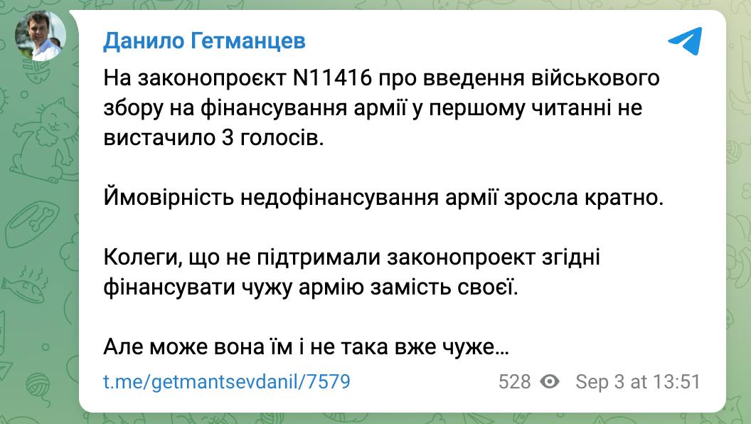 "Вірогідність недофінансування армії зросла кратно", - пише Гетьманцев і звинувачує депутатів у роботі на Росію.