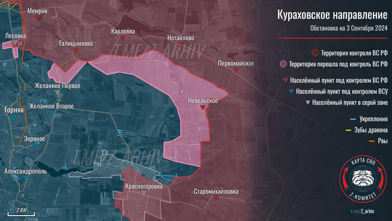 Російські військові паблики сьогодні пишуть про захоплення села Невельське, яке розташоване на найближчому до Донецька виступі української оборони. І на південному фланзі наступу РФ на Покровськ ("Країна" вже аналізувала ситуацію на цьому виступі ).