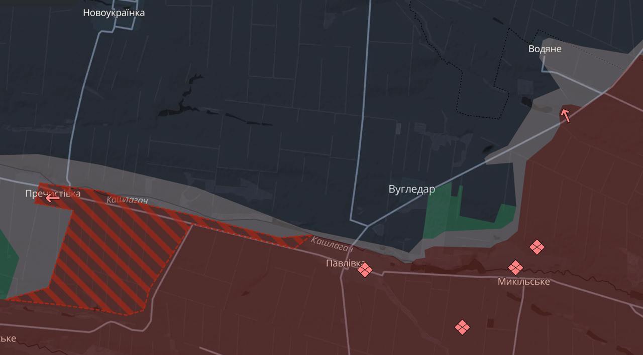 Одночасно продовжується посилення російських атак на півдні Донецької області – під Вугледаром. Російські війська просунулися біля Пречистівки на захід від Вугледару. А також розширили сіру зону в районі Водяного на північний схід.