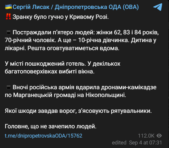 Сьогодні вночі росіяни вдарили по готелю у Кривому Розі. Постраждали п'ятеро людей, серед них 10-річна дівчинка. Зачепило також п'ять багатоповерхівок.