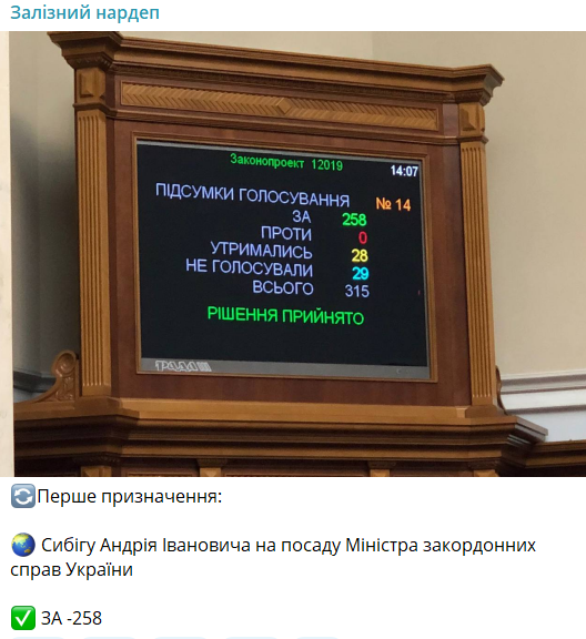 У четвер, 5 вересня, Верховна Рада затвердила Андрія Сибігу новим міністром закордонних справ України. Про це повідомляє народний депутат Ярослав Желєзняк.