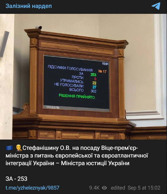 5 вересня Верховна Рада призначила Ольгу Стефанішину віце-прем'єр-міністром з питань європейської та євроатлантичної інтеграції України - міністром юстиції України.