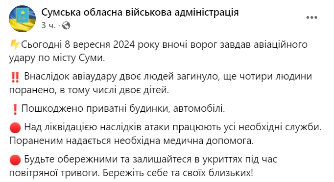 Сьогодні вночі росіяни завдали авіаційного удару по місту Суми. Дві людини. Про це повідомляє Сумська ОВА.