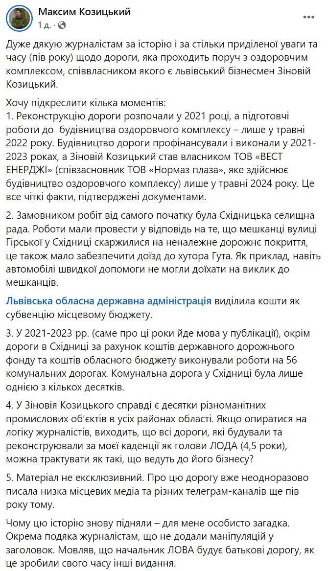 За його словами, реконструкцію дороги розпочали у 2021 році, а підготовчі роботи до будівництва оздоровчого комплексу – лише у травні 2022 року. Будівництво дороги профінансували та виконали у 2021-2023 роках, а Зіновій Козицький став власником готельного комплексу лише у травні 2024 року.