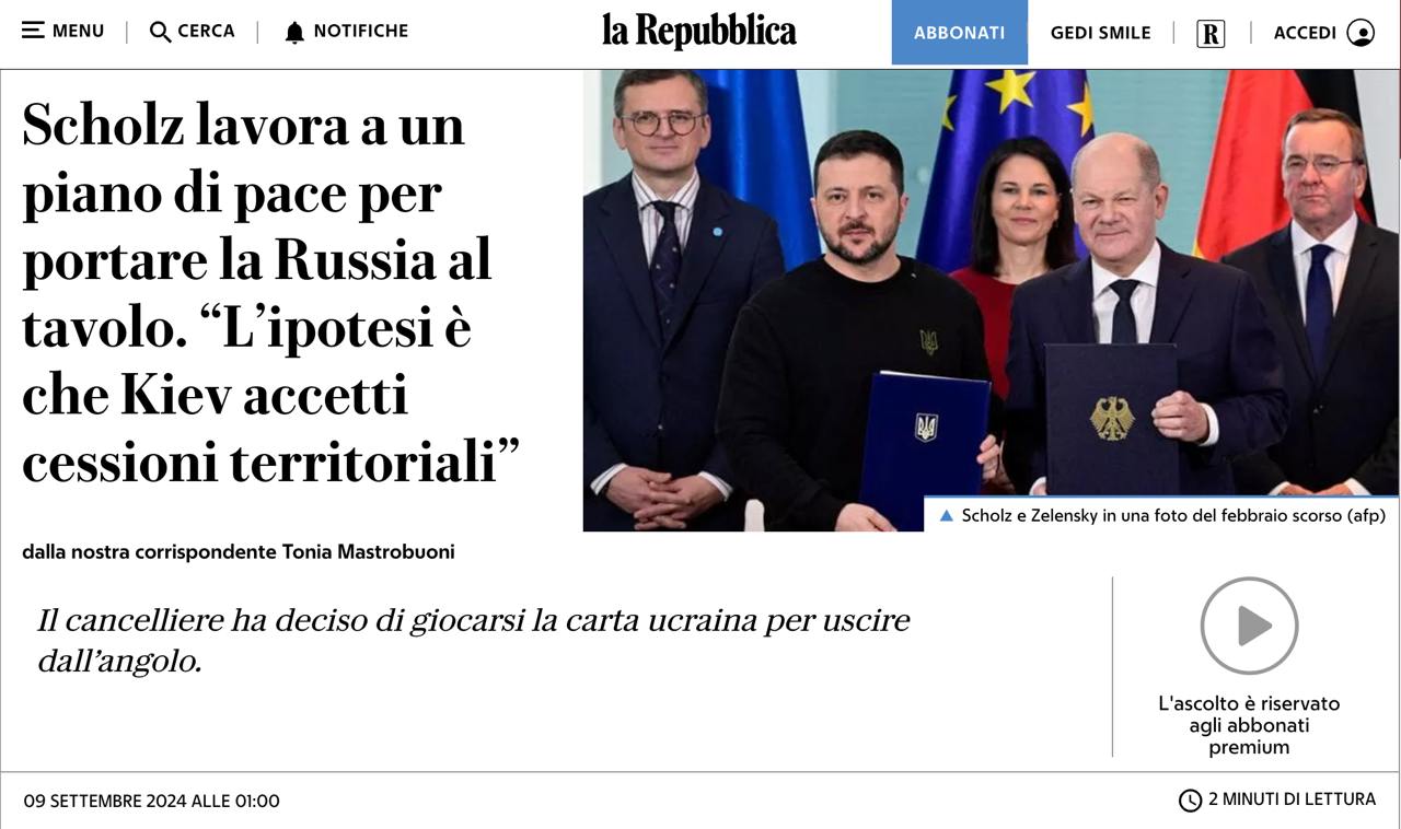 11:35 Канцлер Шольц готує мирний план, який передбачає збереження за РФ захоплених українських територій, пише італійська газета La Repubblica.
