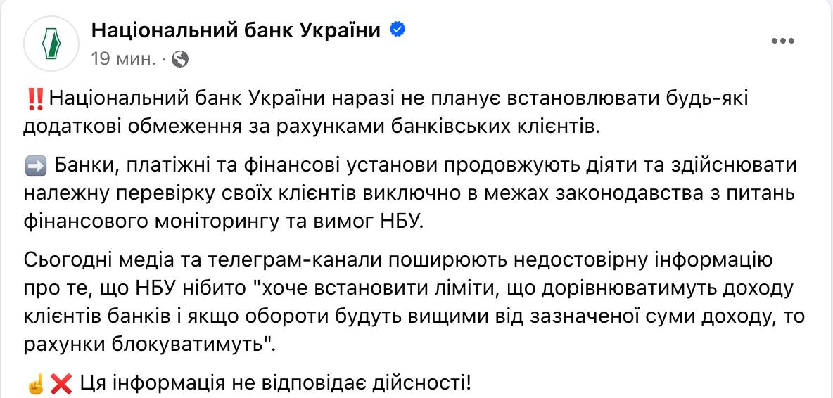 Про це йдеться у повідомленні НБУ у Фейсбуці.