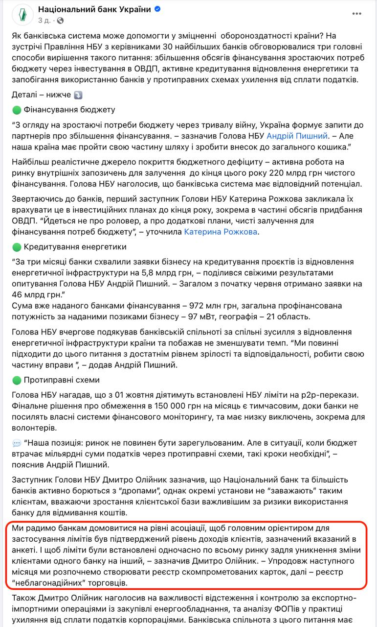 "Ми радимо банкам домовитися на рівні асоціації, щоб головним орієнтиром для застосування лімітів був підтверджений рівень доходів клієнтів, зазначений в анкеті. І щоб ліміти були встановлені одночасно по всьому ринку, щоб уникнути зміни клієнтами одного банку на інший", - заявив заступник голови НБУ Дмитро Олійник.