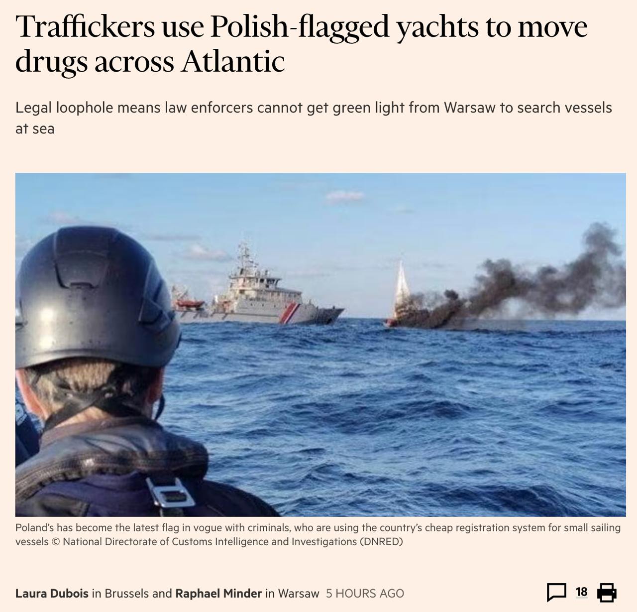 Наприклад, два роки тому португальська влада провела обшук судна під польським прапором у морі біля Азорських островів, заарештувала двох громадян Нідерландів та вилучила 1,2 тонни кокаїну. Але португальський суддя пізніше ухвалив, що операція була незаконною, оскільки Польща не її санкціонувала.