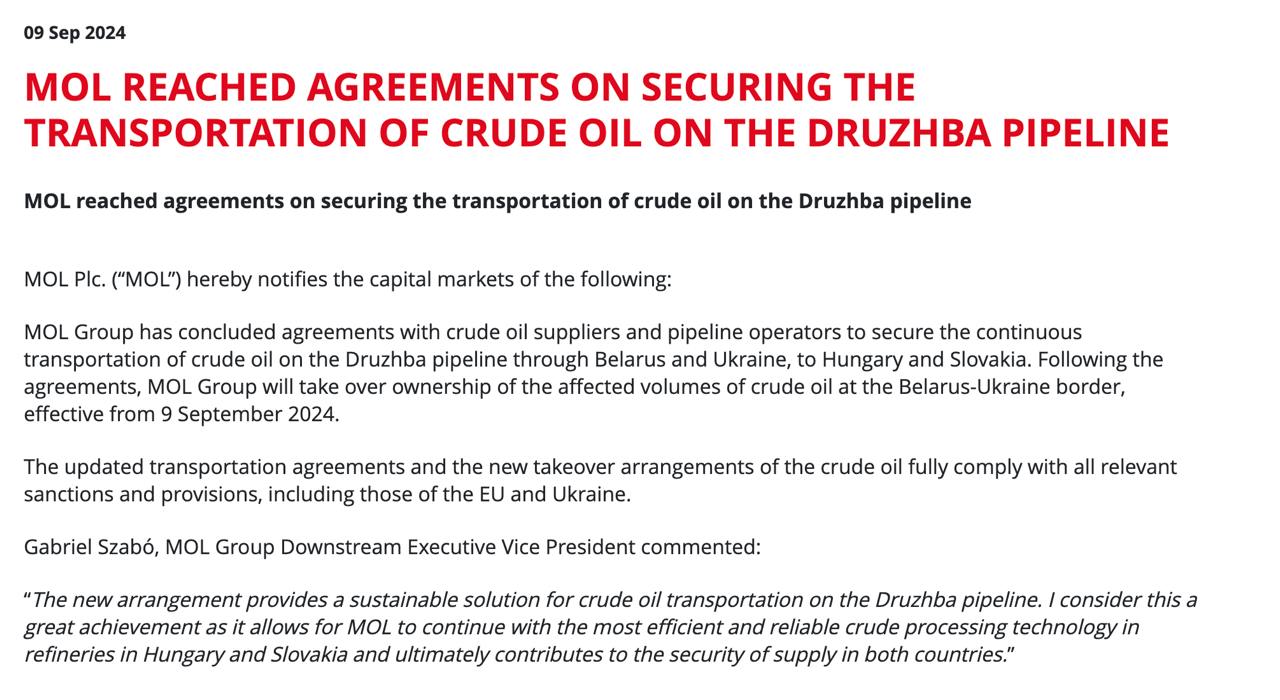 Угорська компанія MOL Group заявляє, що уклала угоду про транспортування сирої нафти через Україну та Білорусь до Угорщини та Словаччини трубопроводом "Дружба".