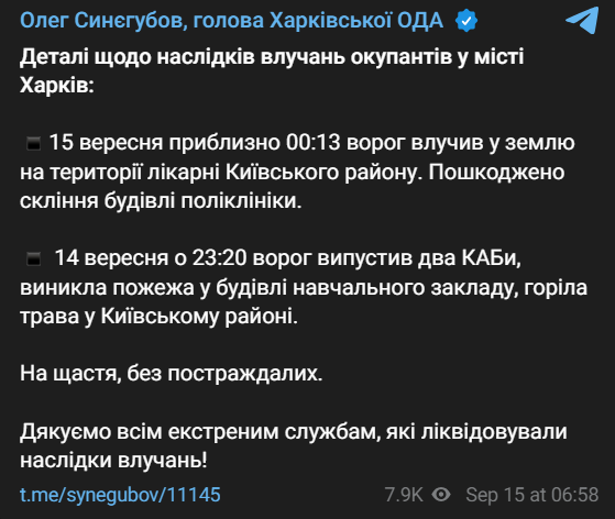 14 вересня о 23:20 росіяни випустили два КАБи, виникла пожежа у будівлі навчального закладу, горіла трава у Київському районі.