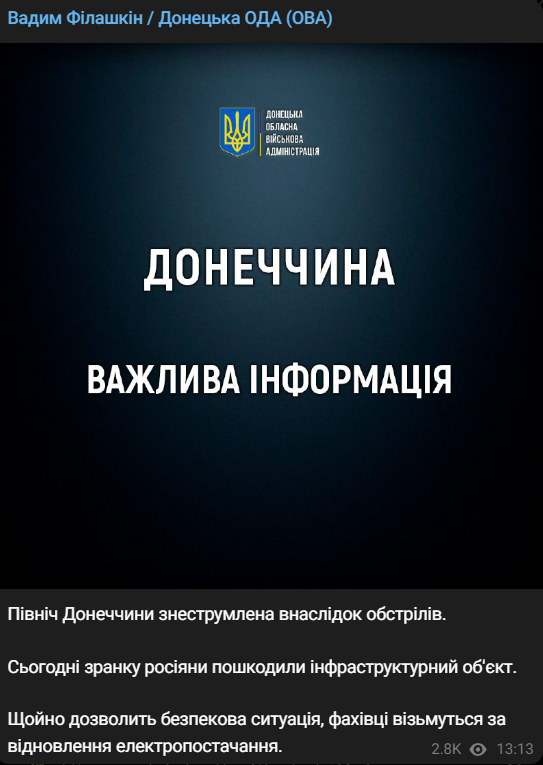 14:47 Північну частину Донецької області знеструмлено внаслідок обстрілів, повідомляє голова ОВА Вадим Філашкін.