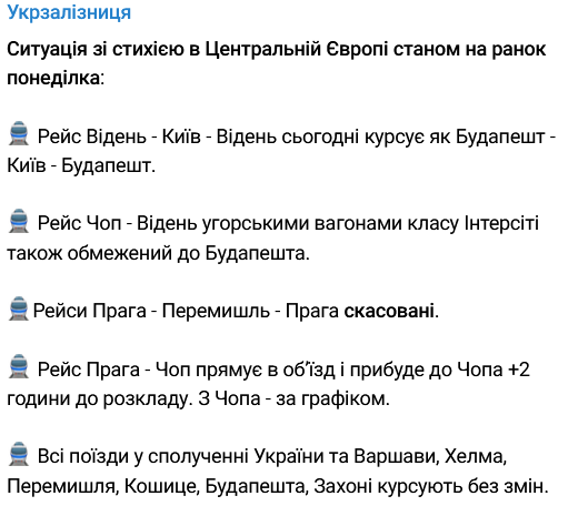 - рейси Прага - Перемишль - Прага долатимуть автобусами затоплену прикордонну ділянку між Граніце-на-Мораві та Рибником;