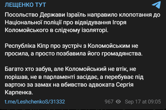 "Посольство держави Ізраїль надіслало клопотання до Національної поліції про відвідання Ігоря Коломойського у слідчому ізоляторі", - написав він.