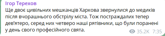 08:15 Ще двоє громадянських мешканців Харкова звернулися до медиків після вчорашнього обстрілу міста, написав мер Ігор Терехов.