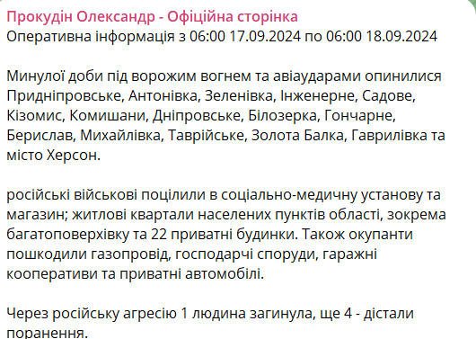 08:20 Минулої доби на Херсонщині в результаті російських обстрілів 1 особа загинула, ще 4 - отримали поранення.