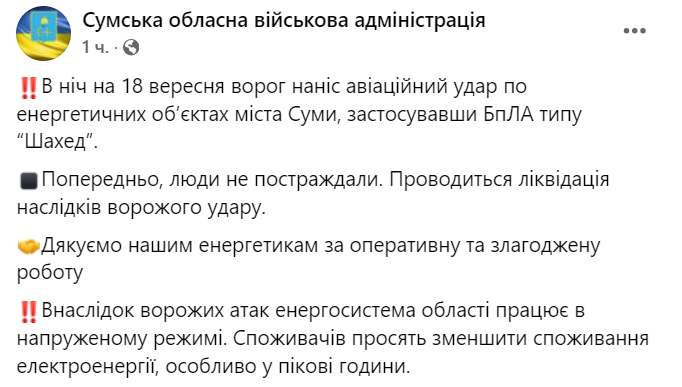 09:00 Вночі росіяни завдали авіаційного удару по енергетичних об'єктах міста Суми, застосувавши БПЛА типу "Шахед".