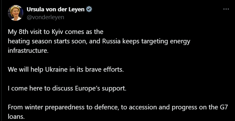 "Росія продовжує націлюватися на енергетичну інфраструктуру. Ми допоможемо Україні у її мужніх зусиллях. Я приїхала сюди, щоб обговорити підтримку Європи. Від готовності до зими до оборони, до вступу та прогресу у сфері позик G7", - написала Урсула фон дер Ляйєн.