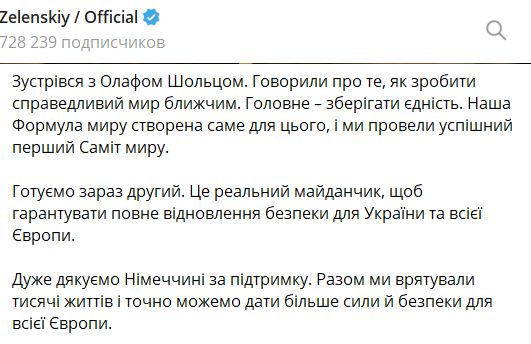 "Говорили про те, як зробити справедливий світ ближчим. Головне – зберігати єдність. Наша формула світу створена саме для цього, і ми провели успішний перший саміт світу. Готуємо зараз другий. Це реальний майданчик, щоб гарантувати повне відновлення безпеки для України та всієї Європи", – заявив український президент.