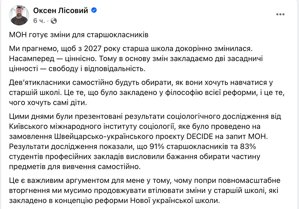 Освіту продовжують реформувати. Фото: facebook.com/oksenlisovyi