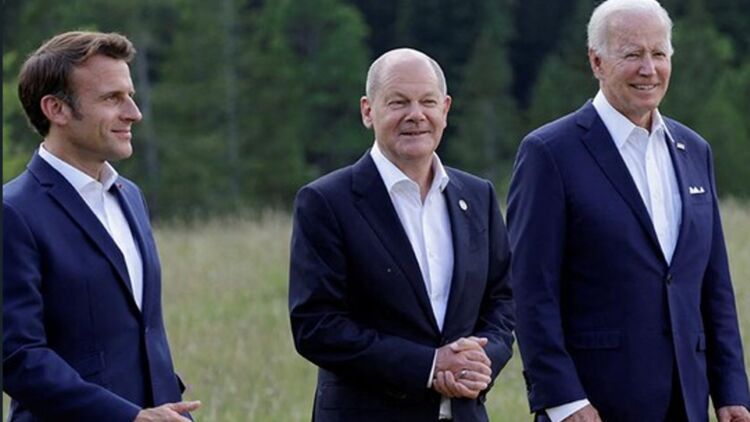 Емманюель Макрон (ліворуч), Олаф Шольц (у центрі) та Джо Байден. Фото: із відкритих джерел