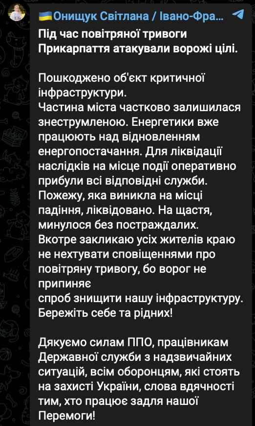 8.29 На Прикарпатті під час нічної атаки пошкоджено об'єкт критичної інфраструктури. Частина Івано-Франківська без світла, повідомляє ова.