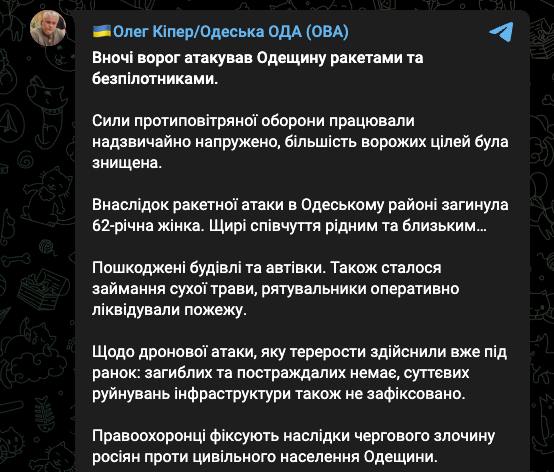 8.52 На Південному Одеській області вчора ввечері після ракетного удару загинула жінка, повідомив губернатор Олег Кіпер.