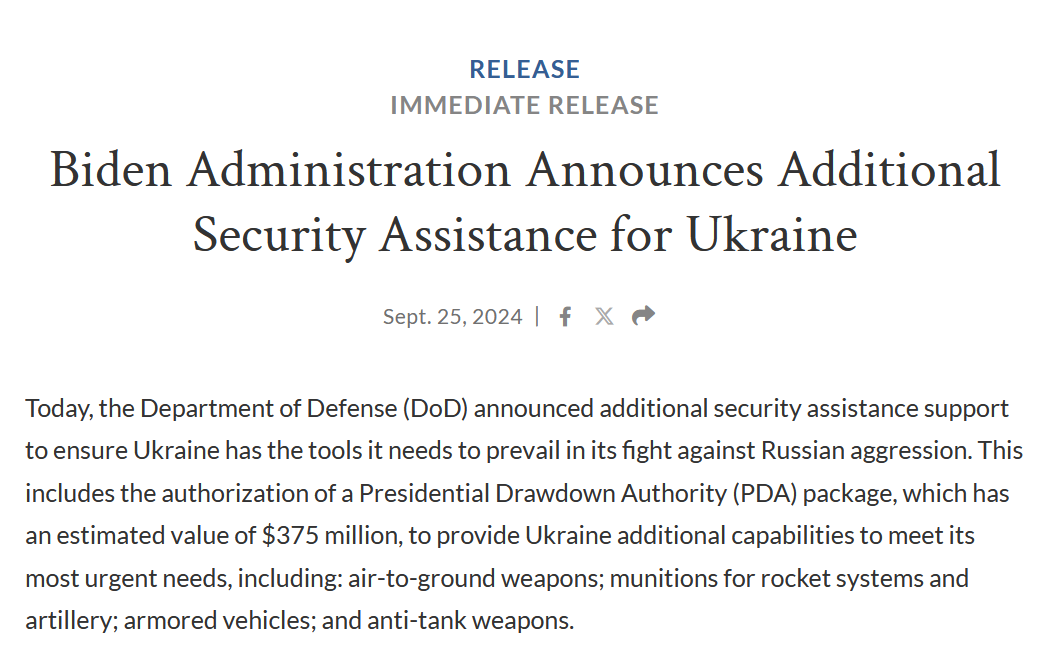 Байден оголосив новий пакет військової допомоги Україні. Що увійде у постачання на $375 мільйонів