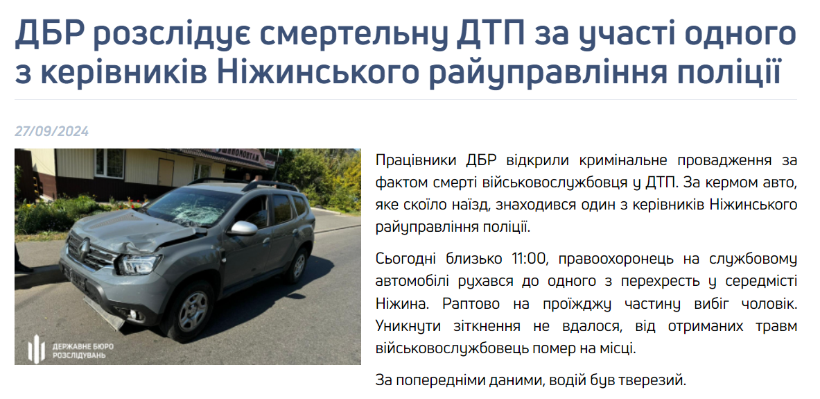 У Ніжині один із керівників місцевого райуправління поліції на службовому авто збив на смерть військового. Про це повідомляє Державне бюро розслідувань.