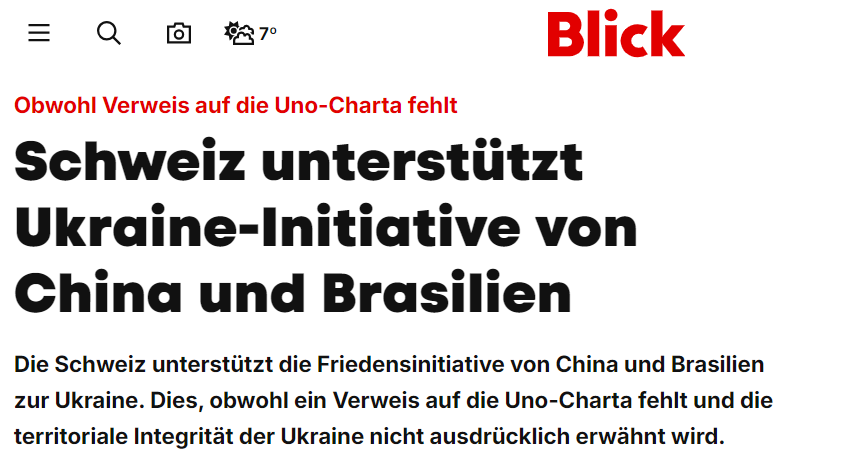 Швейцарія підтримала "мирну ініціативу" щодо України, яку висунули Китай та Бразилія. Незважаючи на те, що в ній немає посилання на Статут ООН і не згадується територіальна цілісність України.