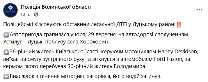 Він виїхав на смугу зустрічного руху і зіткнувся з легковиком. Від удару Harley Davidson, яким керував військовий, спалахнув.