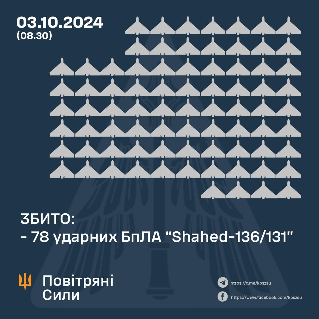 Вночі 3 жовтня Росія запустила Україною 105 безпілотників "Шахед". Із них було збито 78.