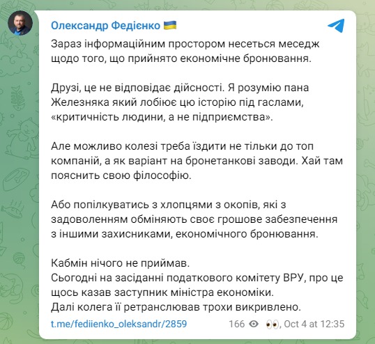 Незабаром після появи публікації інший нардеп, Олександр Федієнко із "Слуги народу", виступив із спростуванням цієї інформації.