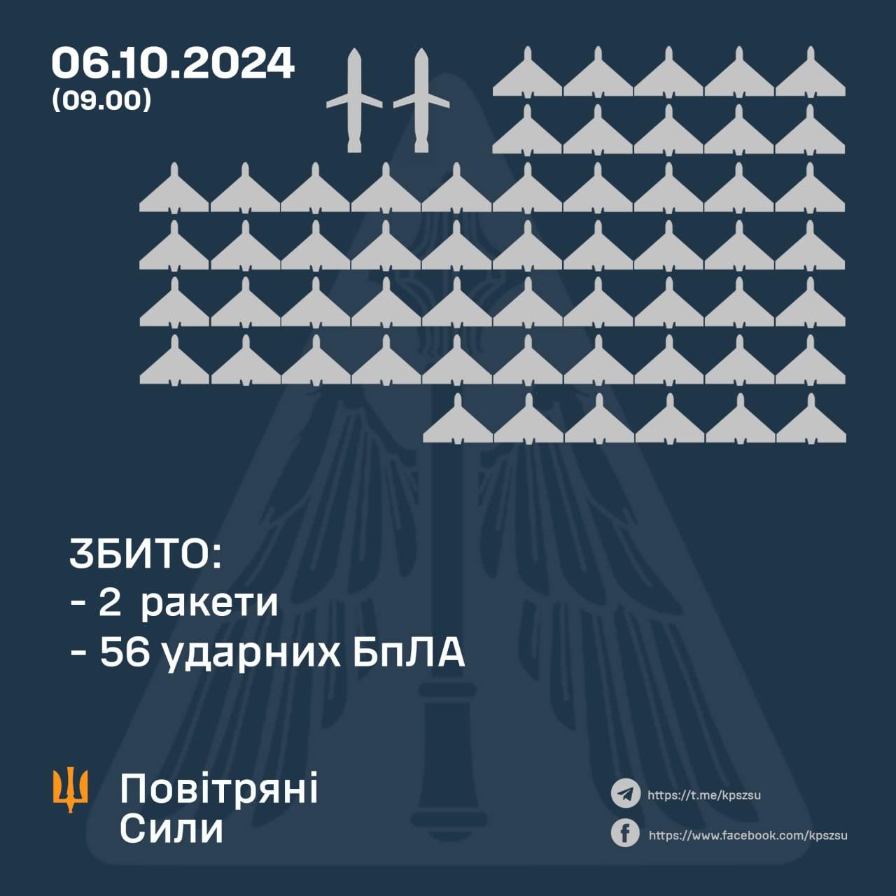 09:50 Вночі з 87 "Шахедів" Україна збила 56, повідомляють Повітряні сили ЗСУ.