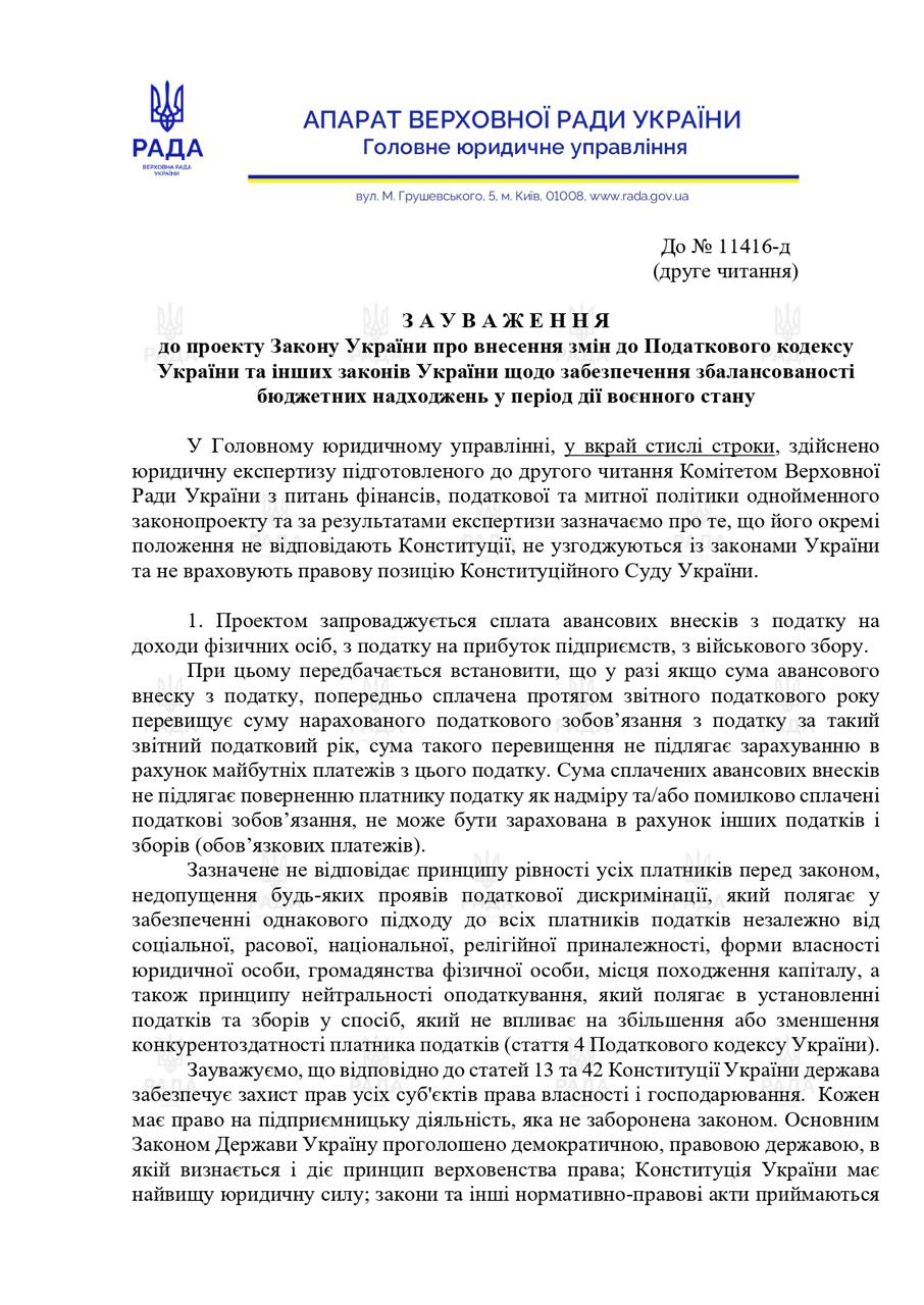 Як зазначено у зауваженнях, окремі положення проекту не узгоджуються із законами України та не враховують правову позицію Конституційного суду. Зокрема, управління зазначило, що запропонований авторами проекту формат сплати авансових внесків із податків не відповідає принципу рівності всіх платників перед законом.