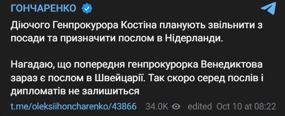 Чинного Генерального прокурора Андрія Костіна планують звільнити та призначити послом до Нідерландів.
