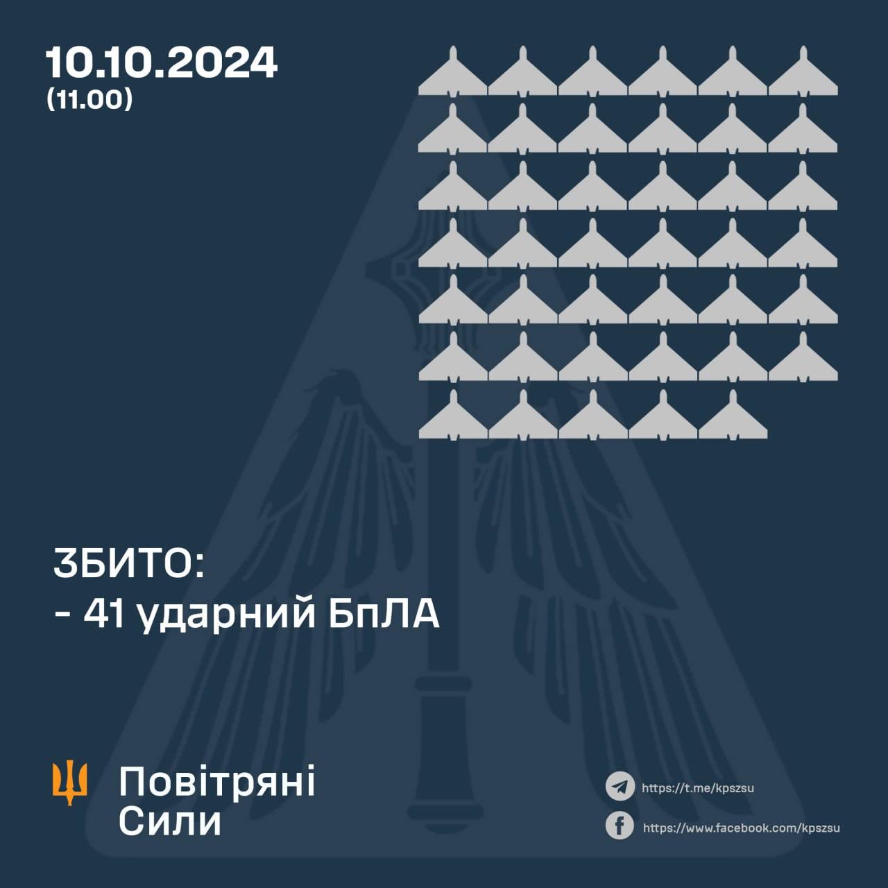 Внаслідок протиповітряного бою збито 41 ворожий БПЛА у Миколаївській, Одеській, Херсонській, Київській, Черкаській, Дніпропетровській, Сумській, Полтавській, Запорізькій та Донецькій областях.