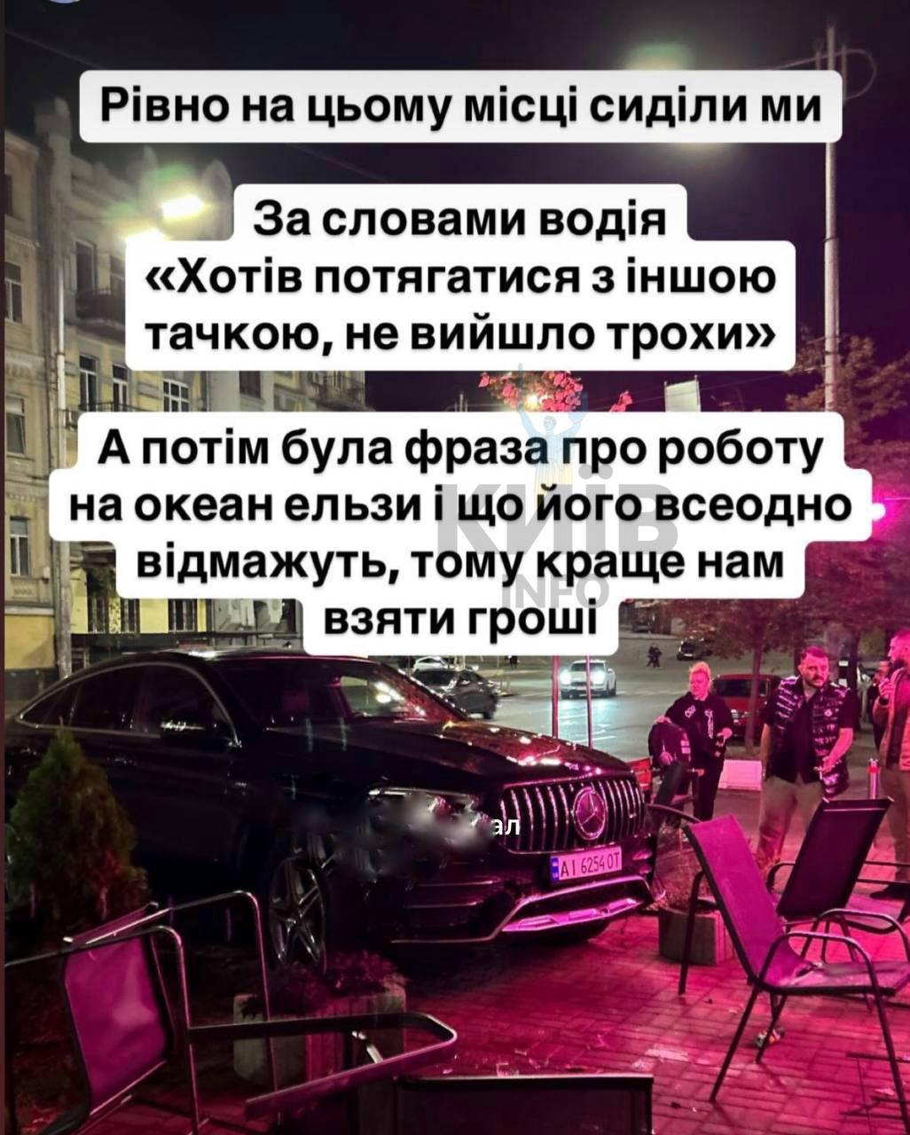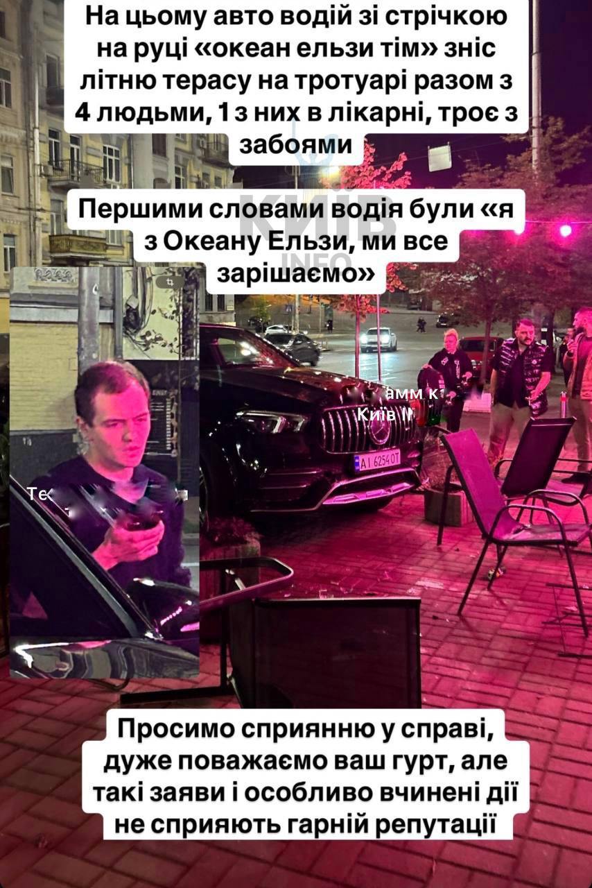 У Києві Mercedes влетів у людей на літньому майданчику ресторану. Водій представився членом команди гурту "Океан Ельзи" Святослава Вакарчука.