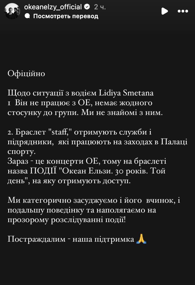 "Він не працює з "ОЕ", немає жодного відношення до групи. Ми не знайомі з ним. Браслет staff отримують служби та підрядники, які працюють на заходах у Палаці спорту. Зараз – це концерти "ОЕ", тому на браслеті назва події "Океан Ельзи". 30 років.