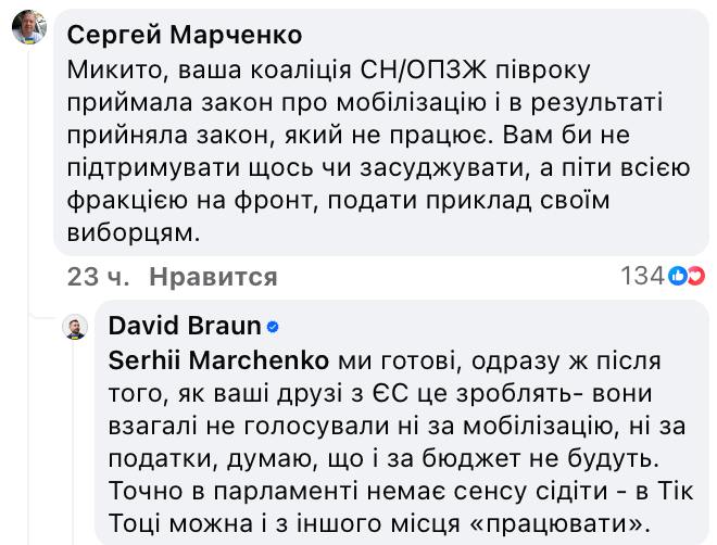 Блогер Сергій Марченко заявив, що правляча партія "півроку ухвалювала закон про мобілізацію і в результаті ухвалила непрацюючий закон. Вам би не підтримувати будь-що або засуджувати, а піти всією фракцією на фронт, подати приклад своїм виборцям".