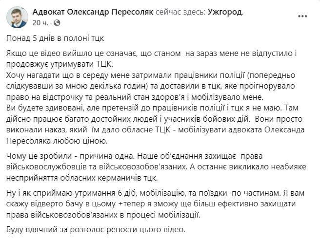 "Хочу нагадати, що в середу мене затримали співробітники поліції (попередньо стежачи за мною кілька годин) і доставили до ТЦК, яке проігнорувало право на відстрочку та реальний стан здоров'я, та мобілізували мене", - написав Пересоляк у Фейсбуці.