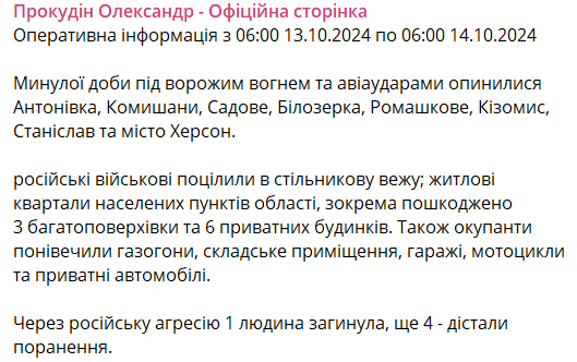 08:00 Минулої доби на Херсонщині в результаті російських обстрілів 1 особа загинула, ще 4 - отримали поранення. Про це повідомляє голова ОВ Олександр Прокудін.